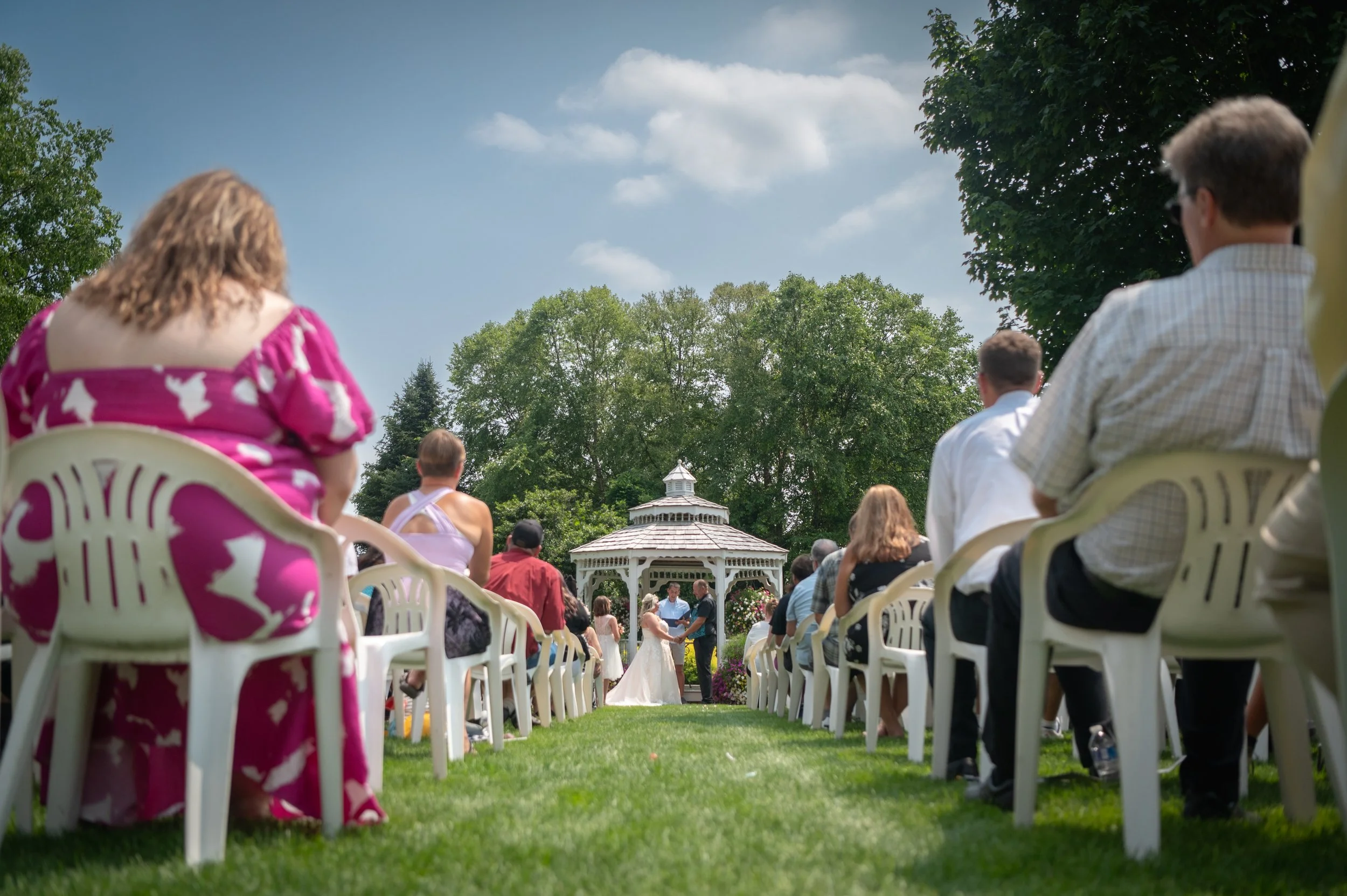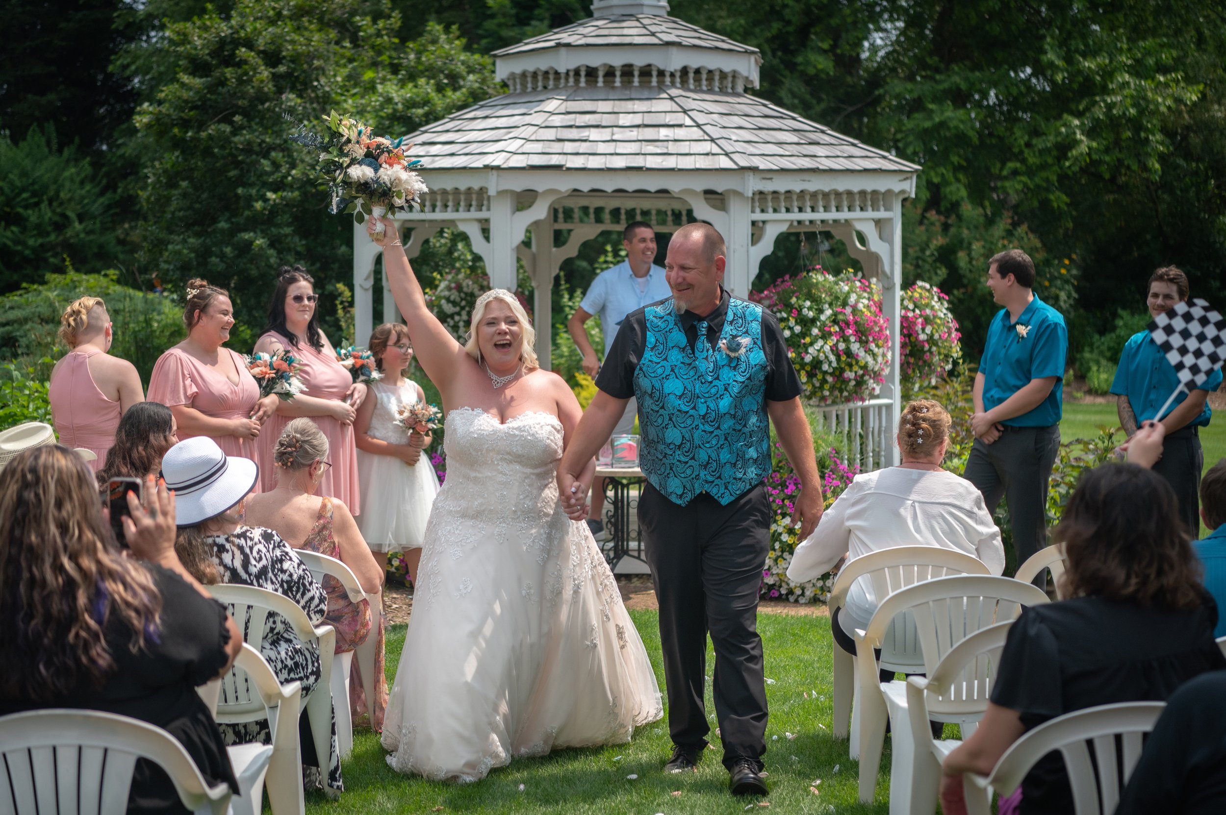 Saturday was a HOT day with a blazing sun. Thankfully our couple thought ahead and made cute fans for their guests to give themselves some air during the ceremony. Along with the fans, their family and friends were given cute checkered flags to wave as they recessed down the aisle, an ode to their love of racing. Their color scheme, particularly with their flowers, was AMAZING. I absolutely loved it! Not to mention that gorgeous dress train of hers!